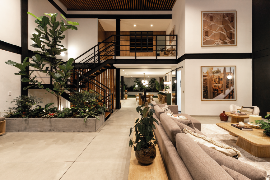 Este proyecto se construyó de tal manera que el esqueleto (estructura) y piel (fachada y techo) estuvieran en el menor tiempo posible para habilitar la obra gris y blanca. Para esto se optó por un sistema de construccion en acero que permitiera disminuir los tiempos de obra. El montaje de dicha estructura se hizo en 2 días. El diseño combina lo moderno de la estructura y el techo con lo tradicional de la mamposteria. Se incluye mucho verde a traves de un jardin interior y plantas sobre la fachada. En la mitad de la casa de diseño una pergola metalica en vidrio y madera para aprovechar la luz solar y ca;entar un poco la casa para lograr mayor confort de los habitantes durante la noche que tiende a ser fria